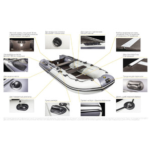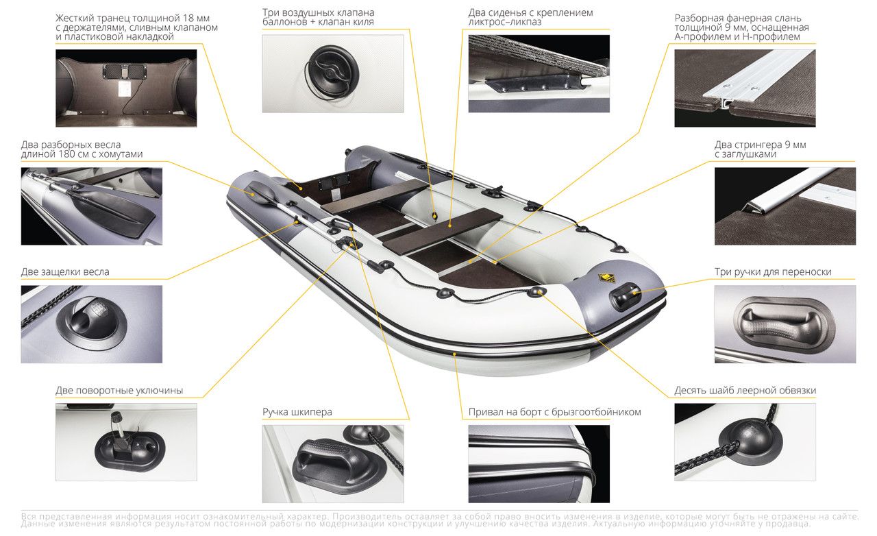 Особенности Ремкомплект, Леерный трос, Клапан для слива воды, Ручки для переноски, Насос, Якорный рым, Уключины, Разборные весла, Подвижные сиденья